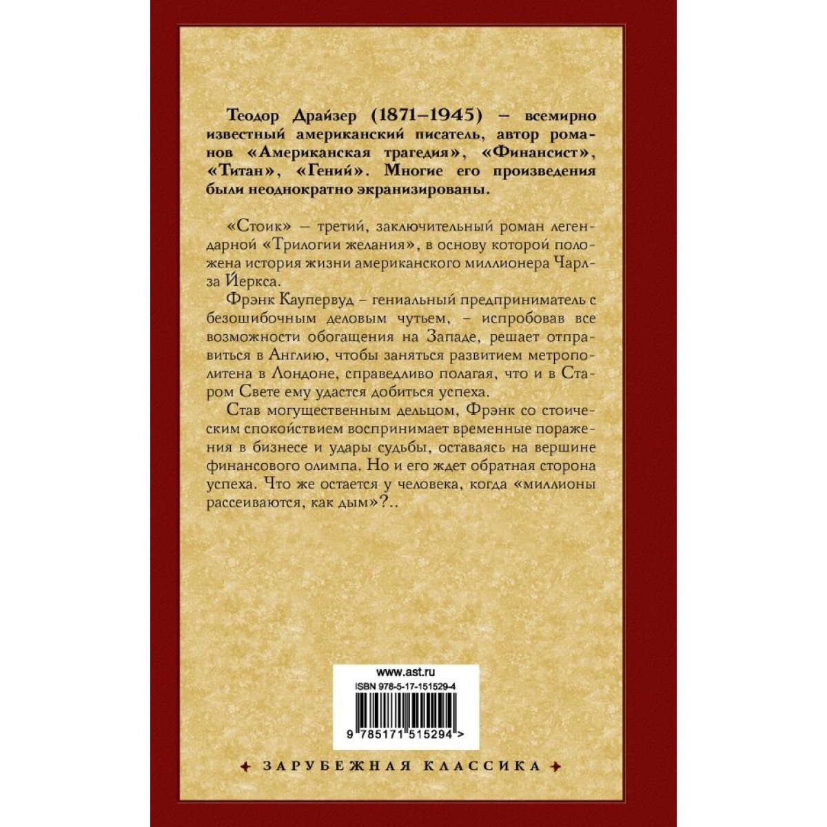 "Стоик" – третий, заключительный роман легендарной "Трилогии желания", в основу которой положена история жизни американского миллионера Чарлза Йеркса.
