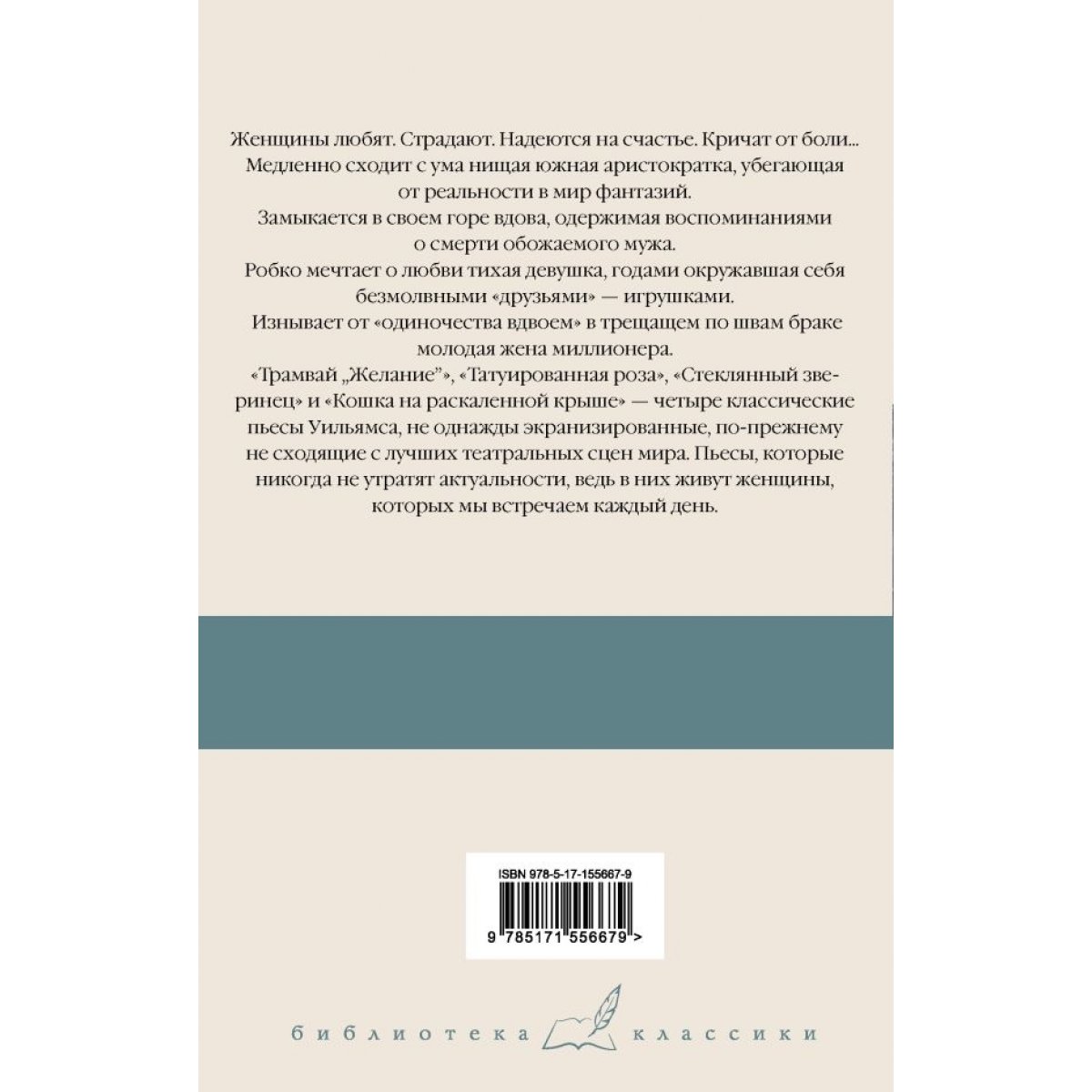 "Трамвай “Желание”", "Татуированная роза", "Стеклянный зверинец" и "Кошка на раскаленной крыше" — четыре классических пьесы Уильямса, не однажды экранизированных, по-прежнему не сходящих с лучших театральных сцен мира. Пьесы, которые никогда не утратят актуальности, ведь в них живут женщины, которых мы встречаем каждый день.