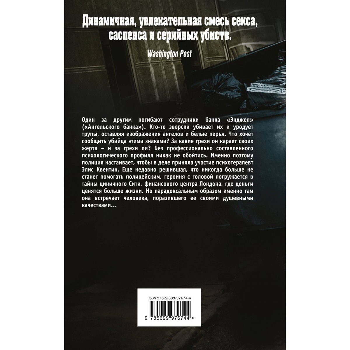 Один за другим погибают сотрудники банка "Энджел" ("Ангельского банка"). Кто-то зверски убивает их и уродует трупы, оставляя изображения ангелов и белые перья. Что хочет сообщить убийца этими знаками? За какие грехи он карает своих жертв – и за грехи ли? Без профессионально составленного психологического профиля никак не обойтись. Именно поэтому полиция настаивает, чтобы в деле приняла участие психотерапевт Элис Квентин. Еще недавно решившая, что никогда больше не станет помогать полицейским, героиня с головой погружается в тайны циничного Сити, финансового центра Лондона, где деньги ценятся больше жизни. Но парадоксальным образом именно там она встречает человека, поразившего ее своими душевными качествами…