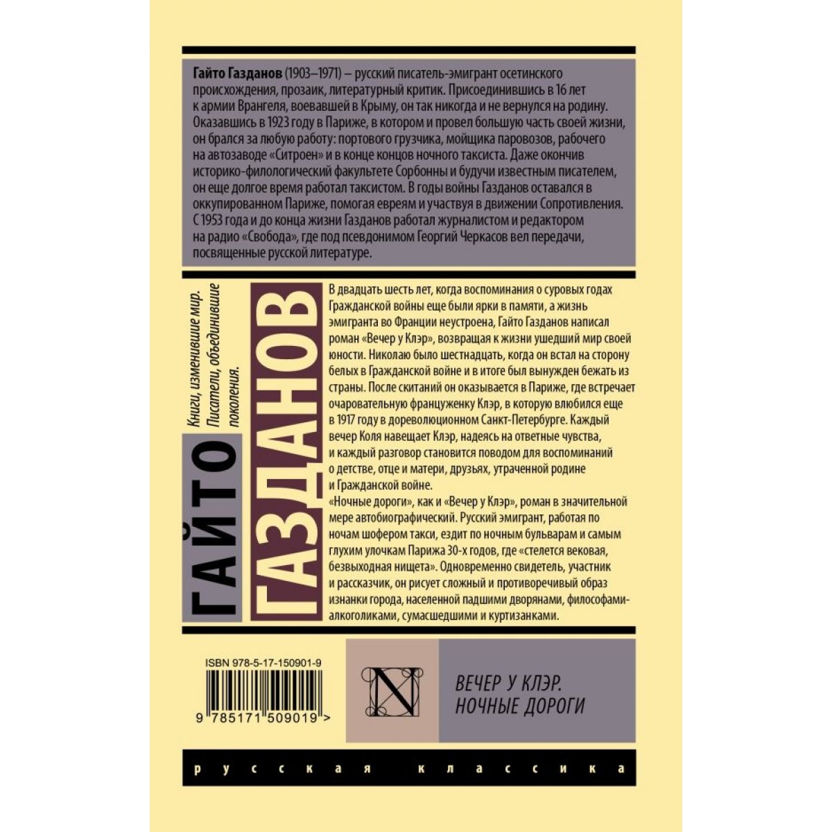 В двадцать шесть лет, когда воспоминания о суровых годах Гражданской войны еще были ярки в памяти, а жизнь эмигранта во Франции неустроена, Гайто Газданов написал роман "Вечер у Клэр", возвращая к жизни ушедший мир своей юности.