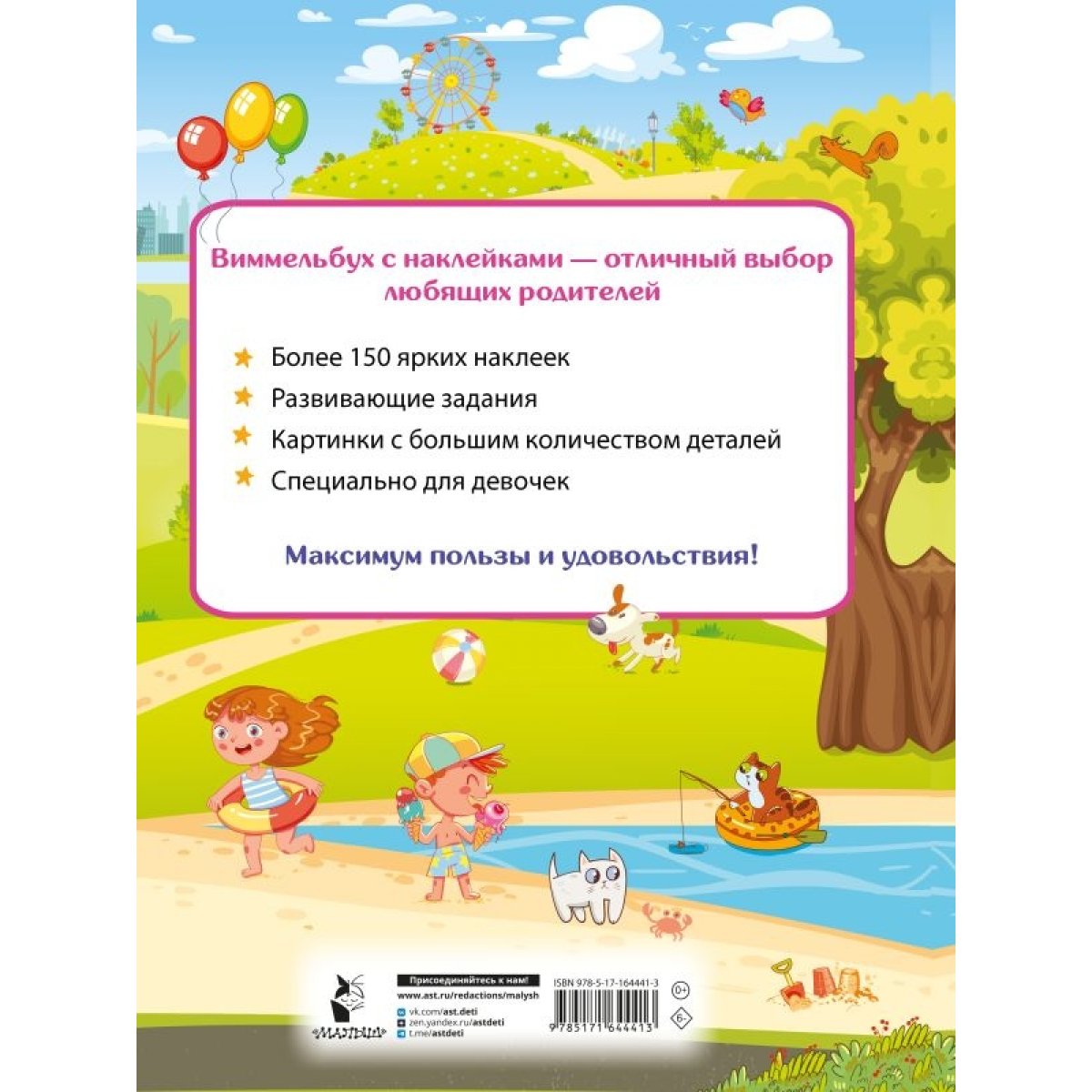 "Виммельбух для девочек. Найди и наклей" — это замечательная книжка, которая понравится любой девочке. Внутри — детальные иллюстрации, минимум текста и яркие наклейки. Малышка с удовольствием рассмотрит картинки и найдёт подходящую для фона наклейку. Весёлые занятия развивают воображение, внимание, мелкую моторику, логику и аккуратность.