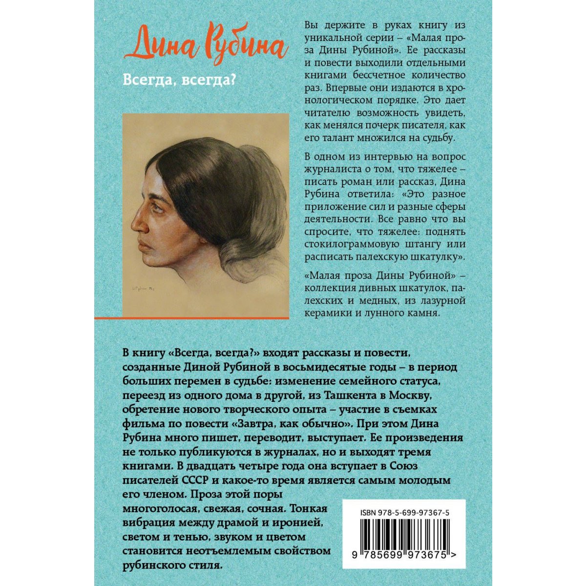 ?В книгу "Всегда, всегда?" входят рассказы и повести, созданные Диной Рубиной в восьмидесятые годы - в период больших перемен в судьбе: изменение семейного статуса, переезд из одного дома в другой, из Ташкента в Москву, обретение нового творческого опыта - участие в съемках фильма по повести "Завтра, как обычно". При этом Дина Рубина много пишет, переводит, выступает. Ее произведения не только публикуются в журналах, но и выходят тремя книгами. В двадцать четыре года она вступает в Союз писателей СССР и какое-то время является самым молодым его членом. Проза этой поры многоголосая, свежая, сочная. Тонкая вибрация между драмой и иронией, светом и тенью, звуком и цветом становится неотъемлемым свойством рубинского стиля.