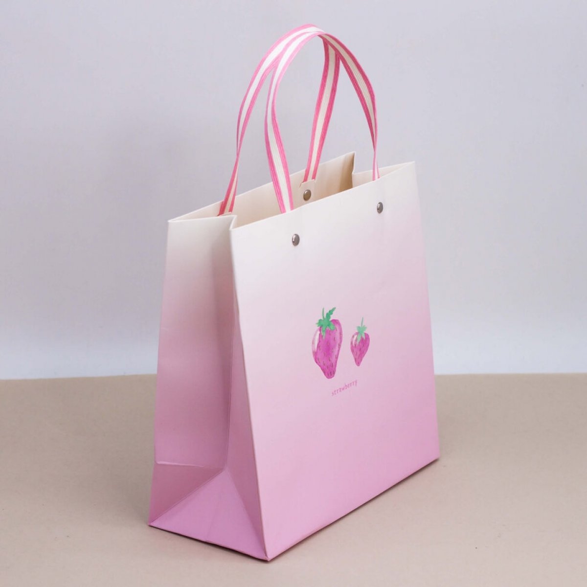 Ручки подарочного пакета плоские из плотной плетённой бумаги, надежно прикреплены к пакету на металлические заклёпки.