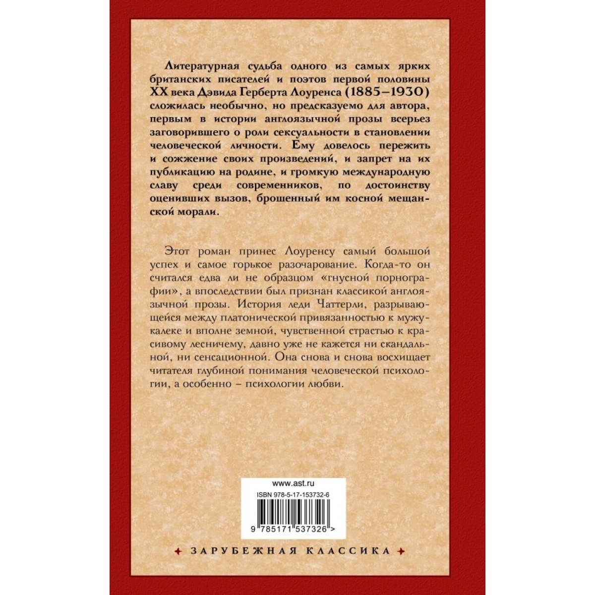 Этот роман принес Лоуренсу самый большой успех и самое горькое разочарование. Когда-то он считался едва ли не образцом "гнусной порнографии", а в последствии был признан классикой англоязычной прозы. История леди Чаттерли, разрывающейся между платонической привязанностью к мужу-калеке и вполне земной, чувственной страстью к красивому лесничему, давно уже не кажется ни скандальной, ни сенсационной. Она снова и снова восхищает читателя глубиной понимания человеческой психологии, а особенно — психологии любви.