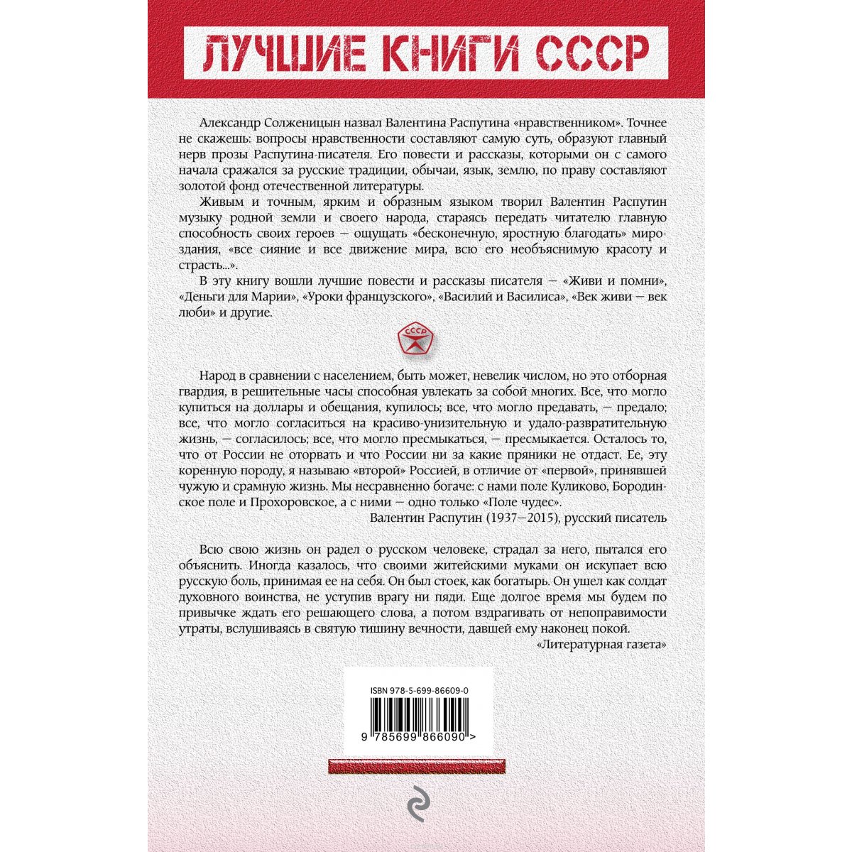 Александр Солженицын назвал Валентина Распутина "нравственником". Точнее не скажешь: вопросы нравственности составляют самую суть, образуют главный нерв прозы Распутина-писателя. Его повести и рассказы, которыми он с самого начала сражался за русские традиции, обычаи, язык, землю, по праву составляют золотой фонд отечественной литературы. Живым и точным, ярким и образным языком творил Валентин Распутин музыку родной земли и своего народа, стараясь передать читателю главную способность своих героев - ощущать "бесконечную, яростную благодать" мироздания, "все сияние и все движение мира, всю его необъяснимую красоту и страсть...". В эту книгу вошли лучшие повести и рассказы писателя - "Живи и помни", "Деньги для Марии", "Уроки французского", "Василий и Василиса", "Век живи - век люби" и другие.